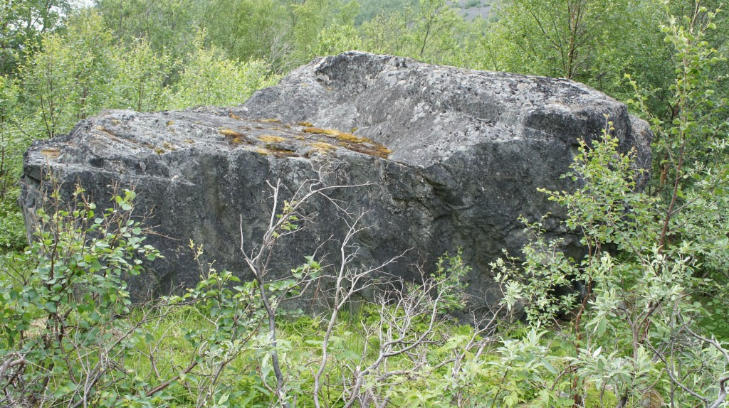 Juuso – familie bygde en gamme bak steinen som et skydd mot snøras. Dette må ha virket etter hensikten siden gammen sto der i alle år. To bilder fra forskjellige vinkler.