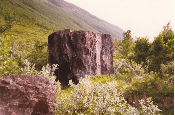 Juuso – familie bygde en gamme bak steinen som et skydd mot snøras. Dette må ha virket etter hensikten siden gammen sto der i alle år. To bilder fra forskjellige vinkler.