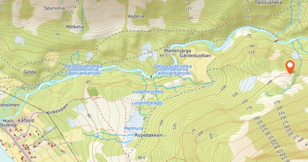 Čohkkápmir ligger på østsiden av dalen. Fra bygda kan ses en haug eller en rund lita fjell, skogbevokst. Veldig karakteristisk og synlig.