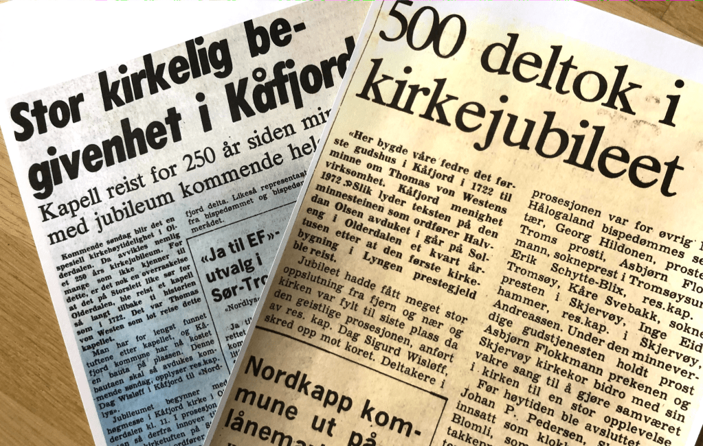 250 års jubileet i 1972 ble et stort arrangement. Kåfjord kommune i samarbeid med menighetsrådet og presten sto for arrangementet. Dag Sigurd Wisløff var prest i den perioden. Han minnes en hektisk tid der han blant annet fikk i oppdrag å skrive et minneskrift om «Finnekapellet» og samtidig gi et kirkehistorisk tilbakeblikk om Kåfjord Sokn og Lyngen Prestegjeld. Han starter tilbakeblikket slik :