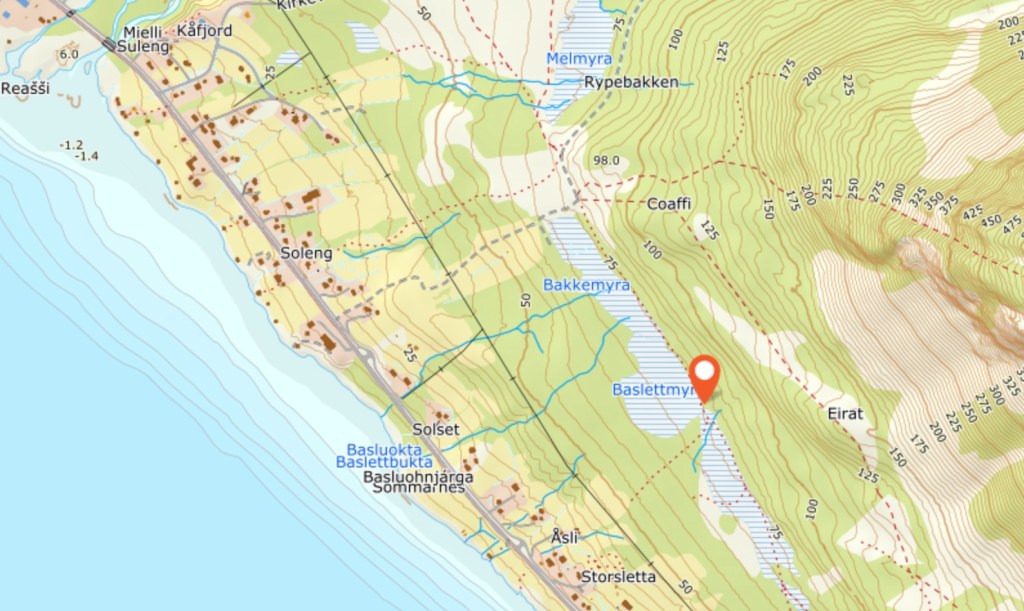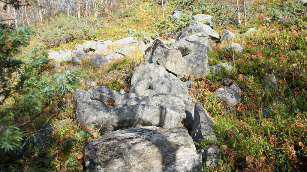 Fortsatt kan man se rester av steingjerde under Eirat.Omtrent her sto skillegjerdet.