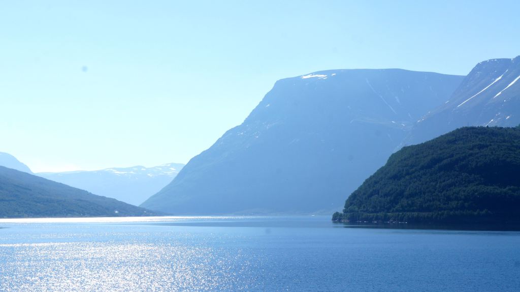 Nede på blanksjøen, hvor fjellene står speilvendte og tindrende, ligger hele flak av måser og døser i solsteken, og langs steinstrendene ror ærfuglkull. Ærfuglen er fredet, og så finnes den også over alt, uredd, dunete og brunsvart. Og så klart er vannet at en kan se teglrøde sjøstjerner krype makelig omkring mellom bunnsteinen. Fjellbekkene bruser til alle kanter, den lavvokste og kronglete bjørkeskogen ligger som et luftig slør over strendene og et stykke opp i fjellsidene. Ikke et vindpust rører det skinnende blanke bjørkelauvet.