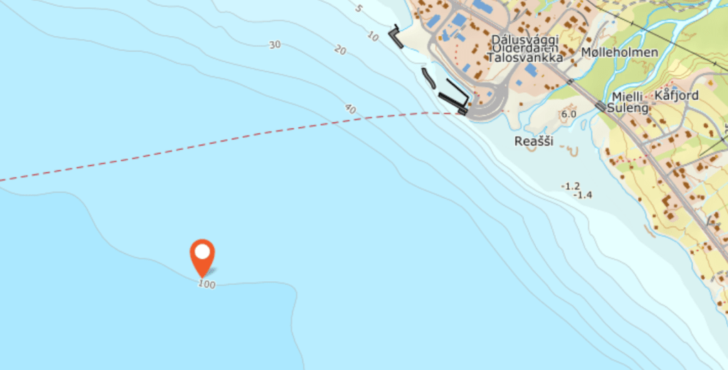 Átnȷu er en kjent fiskeplass utenfor Soleng. Mea: Når Gilavárri faller ned i `hakket` i Áɲubealgi (se bildet) og Ysteby-nesset og Årøya går i ett, er vi på fiskeplassen Átnȷu. Fra gammelt av en meget god fiskeplass. I følge lokale fiskere er det ikke fisk å få lenger. Noe har skjedd.. Laksemerdene i fjorden kan være en årsak. Fjellets formasjon Áɲubealgi. På norsk Kjeiptind. Fjellet form ligner en keip, tollepinne. Fiskeplassen har fått navnet etter fjellformasjonene.