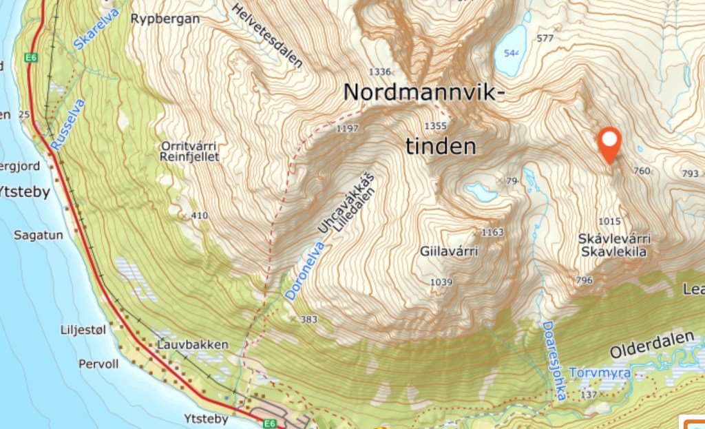 J. Qvigstad har registrert følgende: På nordsiden av Vinterdalen er fjellene Skavlevárri, Rismmalčohkka, n.Rismåltinden, Átnju (kjeipen), n.Kjeiptinden og Skoabaidanvárri med Skobaidanriehppi.