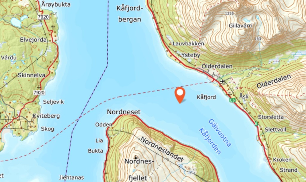 Fiskeplass rett utenfor Olderdalselva/Talosvankanjoki. Midt i fjorden på vel 100 meters dyp.