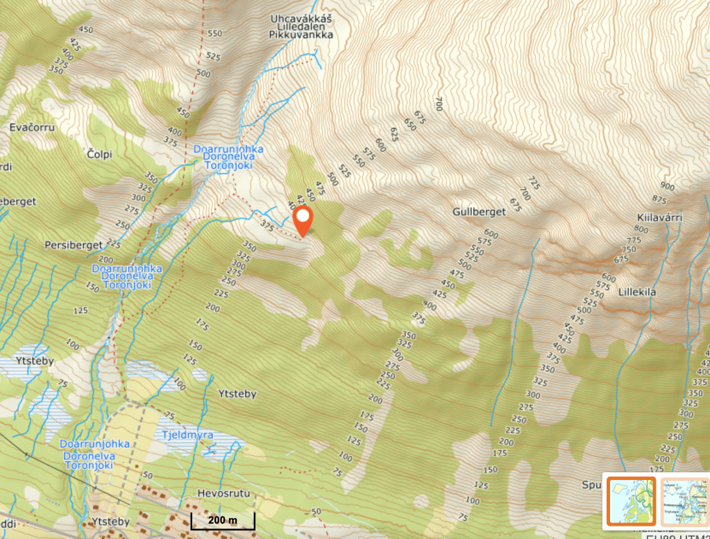 Fra turkasse i Lilledalen/Pikkuvankka/Uhcavákkáṧ følger man høydedraget mot Kila. I enden av stien går det en bratt skrent nedover fjellsiden.