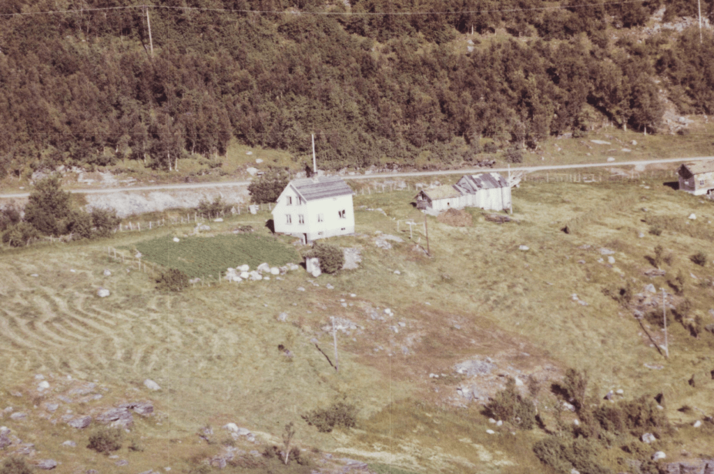 Her bodde lærer Peder Soleng og helsesøster Valborg Soleng. I skogbrynet ser vi gammelhuset. Mye spennende vi fant på i det huset.