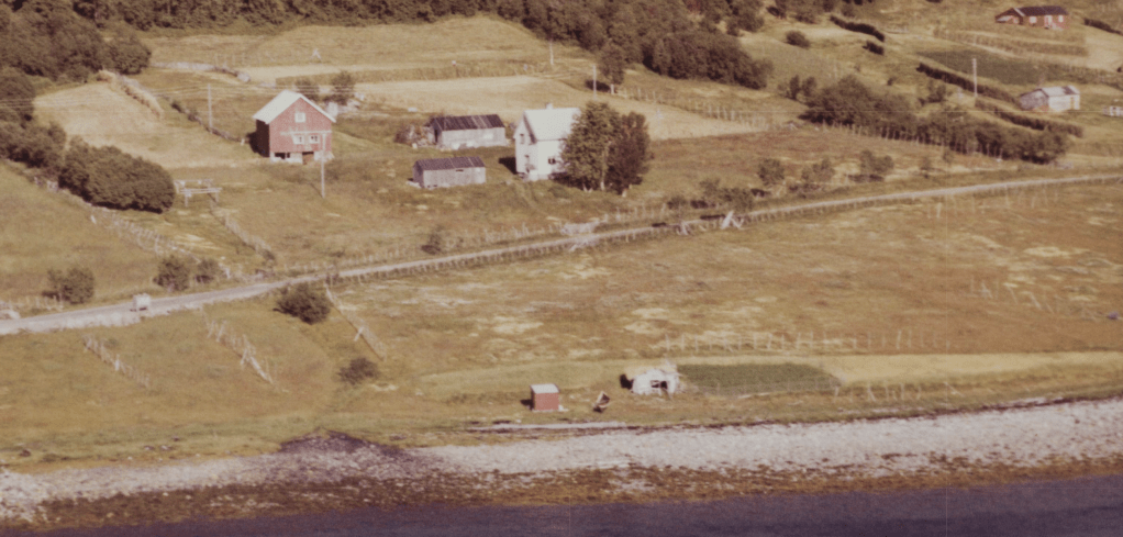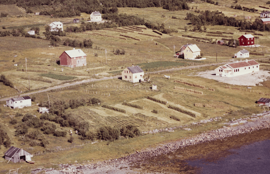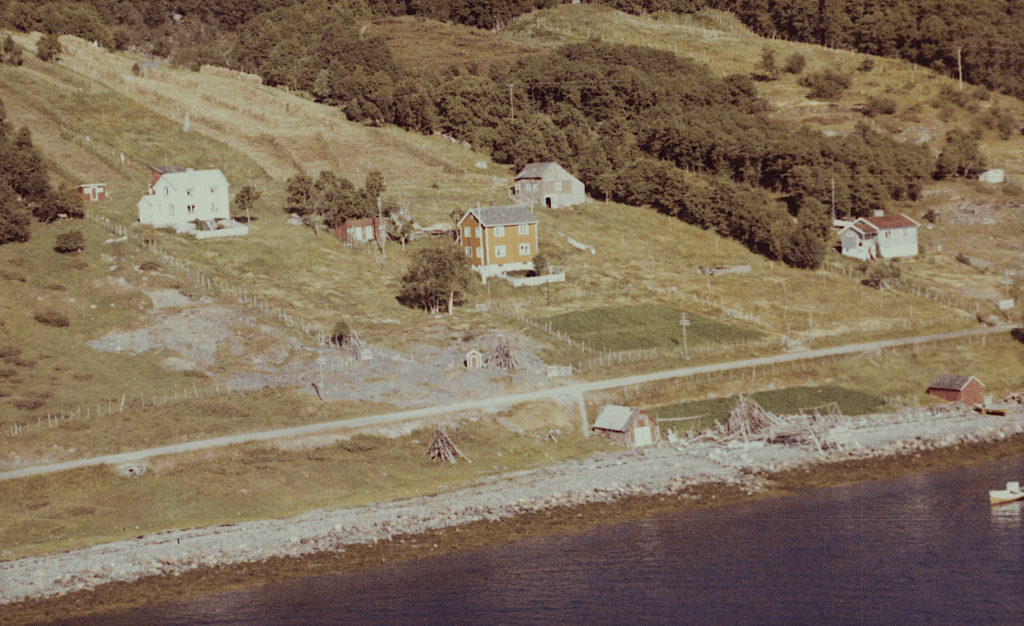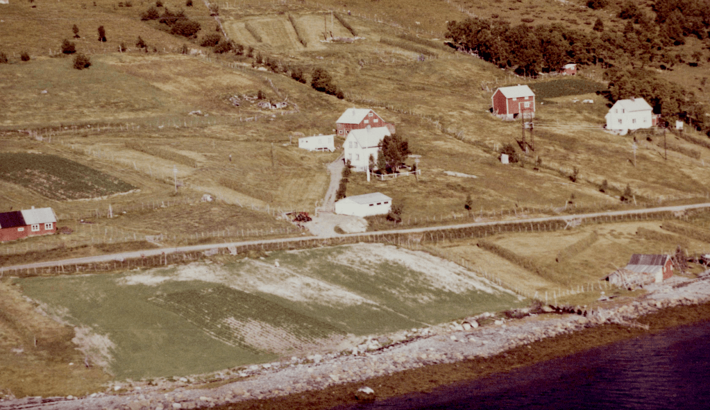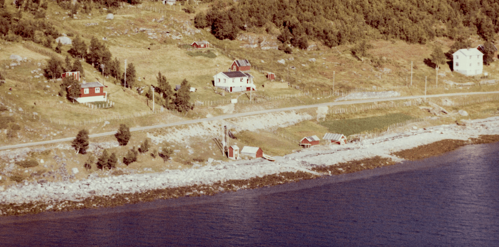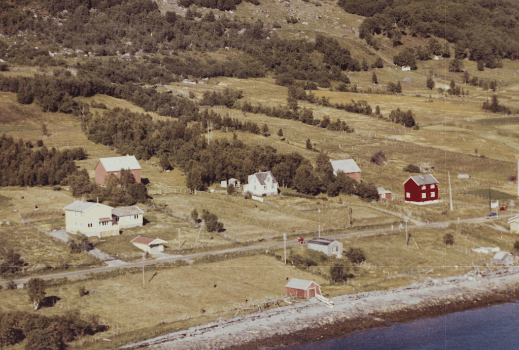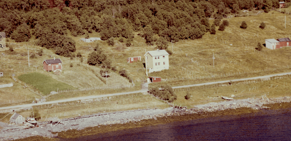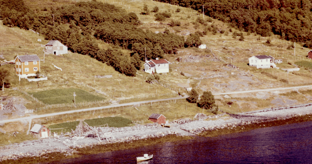 Til høyre i et lite hvit hus bodde Else og Bjarn Soleng. Like bak der et enda mindre hus hvor min bestemor Rasmine Olsen bodde. Videre ser vi for huset til Gudrun og Arthur Soleng og Gerd og Olav Olsen. Oppe på bakken (Tjårrobakken»)bodde Henrik Olsen i det minste huset. Til venstre for Henrik bodde Agnethe og Ole Olsen, i en gammel brakka fra krigens dager. Nedenfor veien, der Fritz Henrik bor, kalte vi for»Storsommar». Der hadde vi mange harde fotballkamper.Tidlig bart på våren.
