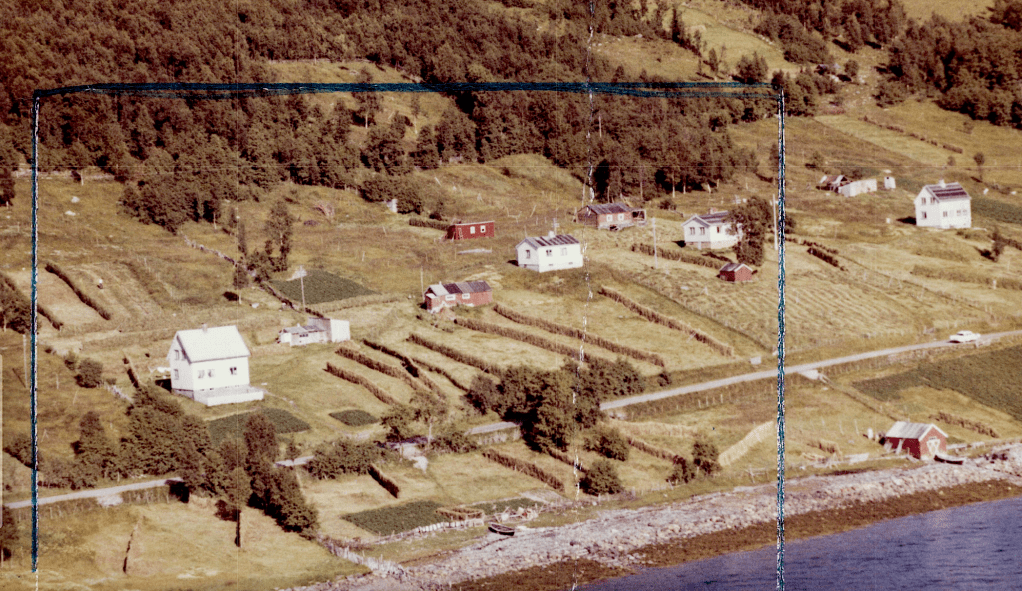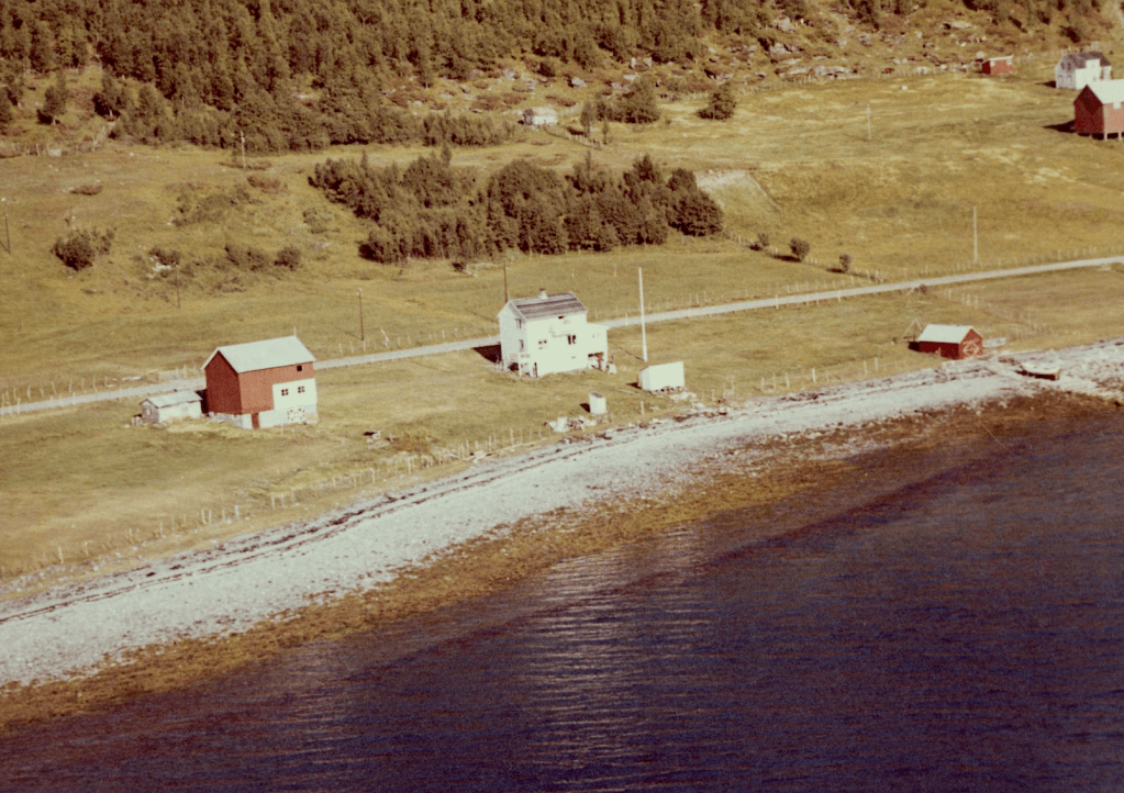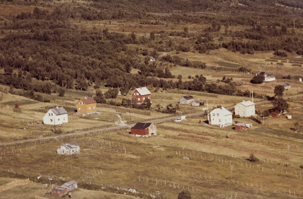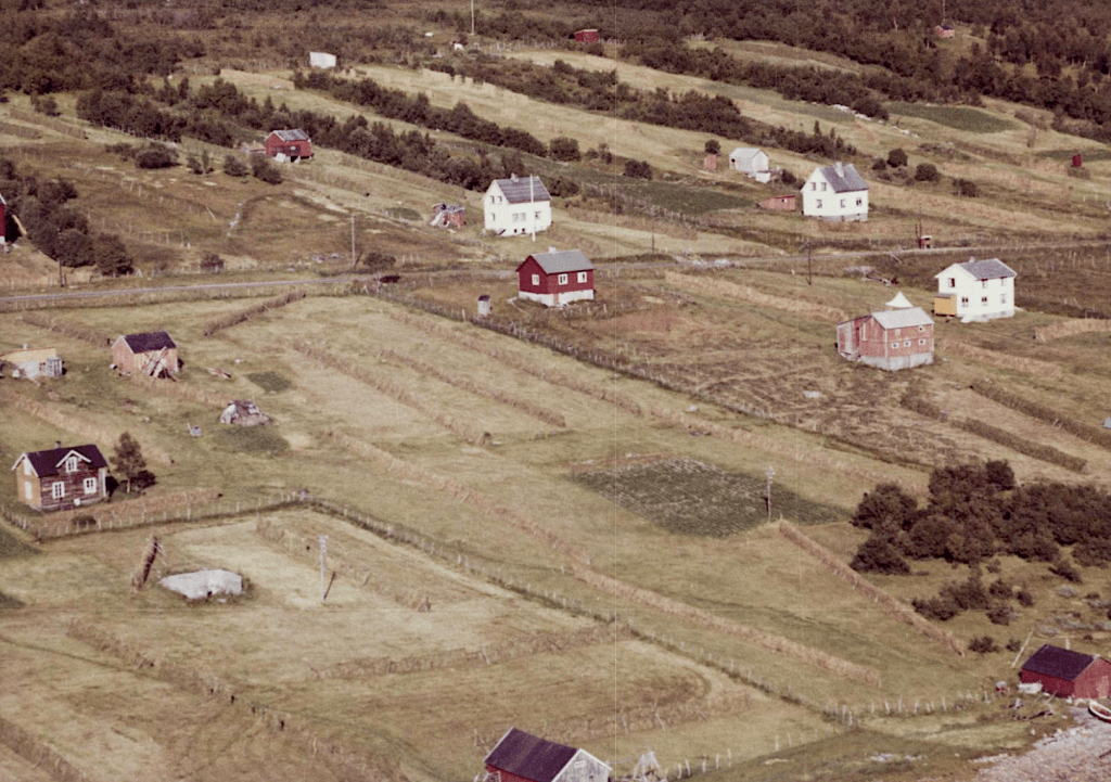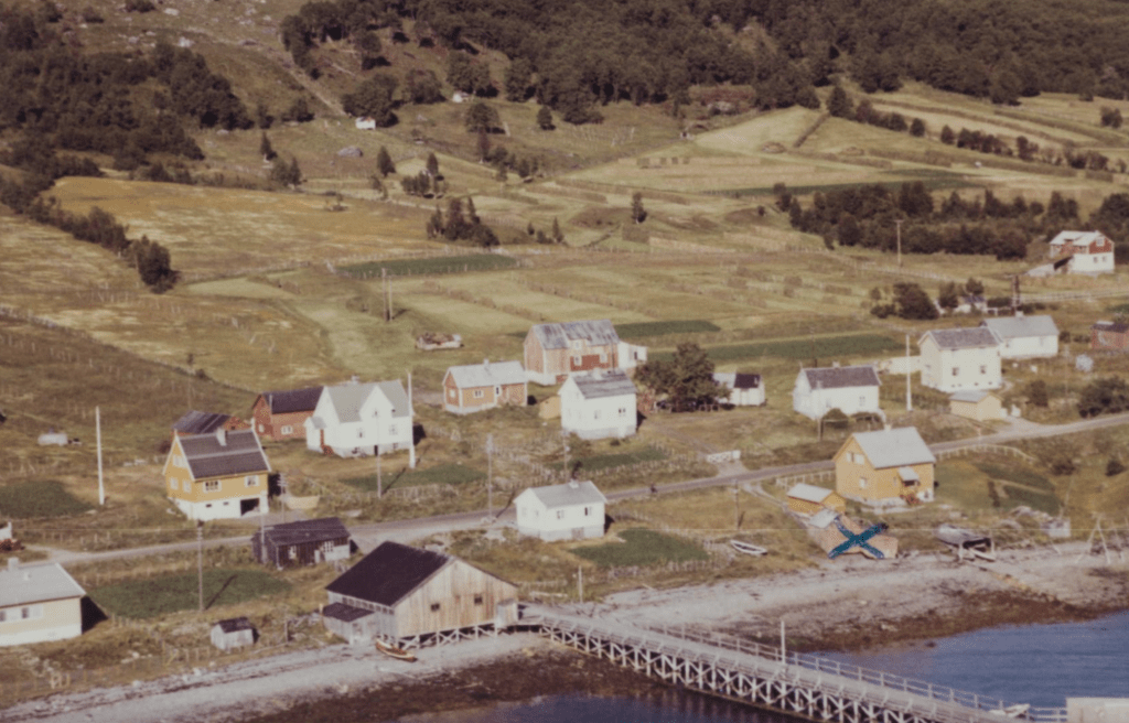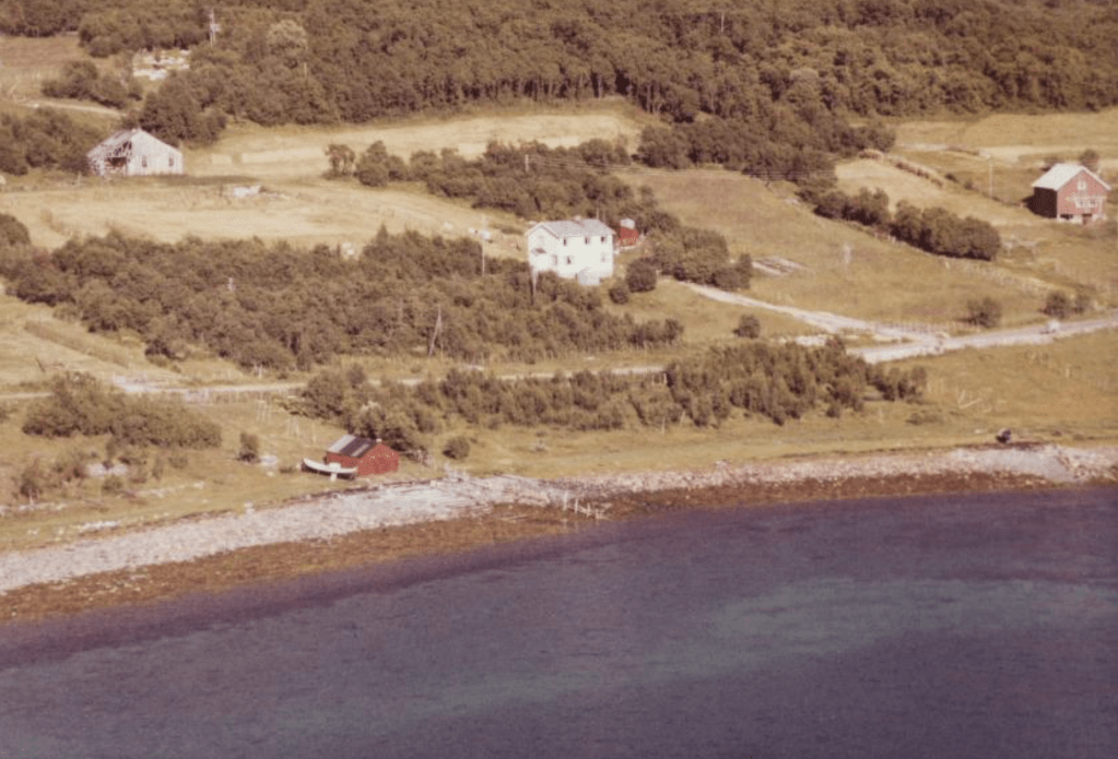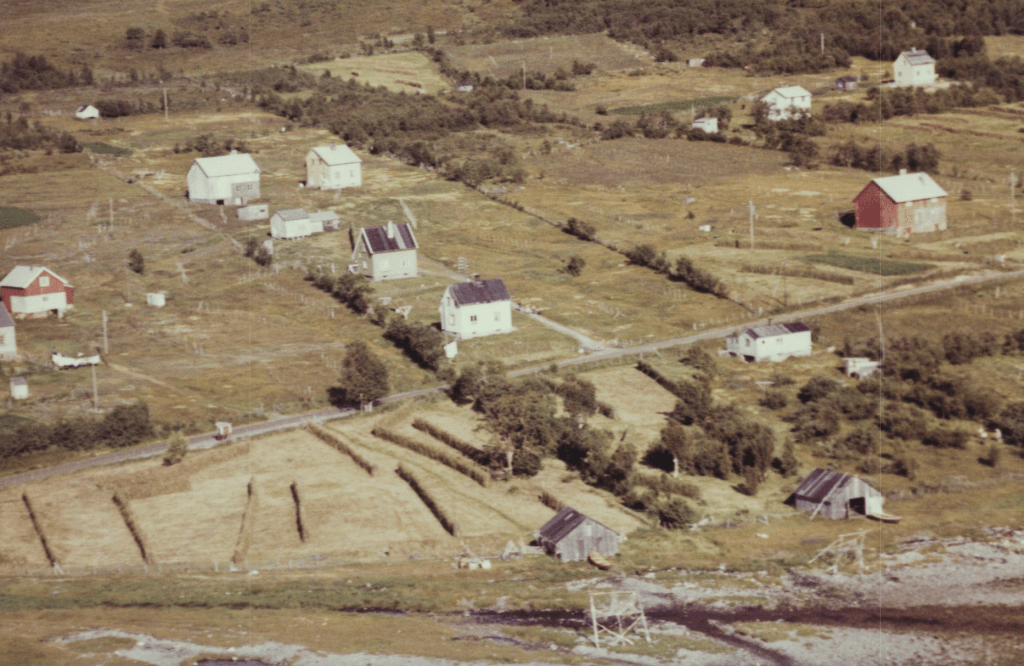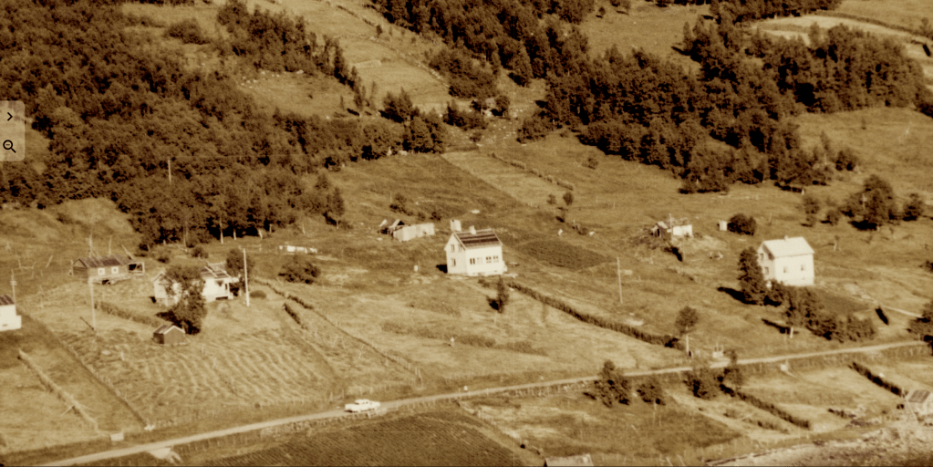 Til høyre i et lite hvit hus bodde Else og Bjarn Soleng. Like bak der et enda mindre hus hvor min bestemor Rasmine Olsen bodde. Videre ser vi for huset til Gudrun og Arthur Soleng og Gerd og Olav Olsen. Oppe på bakken (Tjårrobakken»)bodde Henrik Olsen i det minste huset. Til venstre for Henrik bodde Agnethe og Ole Olsen, i en gammel brakka fra krigens dager. Nedenfor veien, der Fritz Henrik bor, kalte vi for»Storsommar». Der hadde vi mange harde fotballkamper.Tidlig bart på våren.