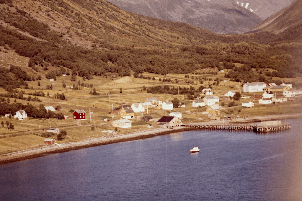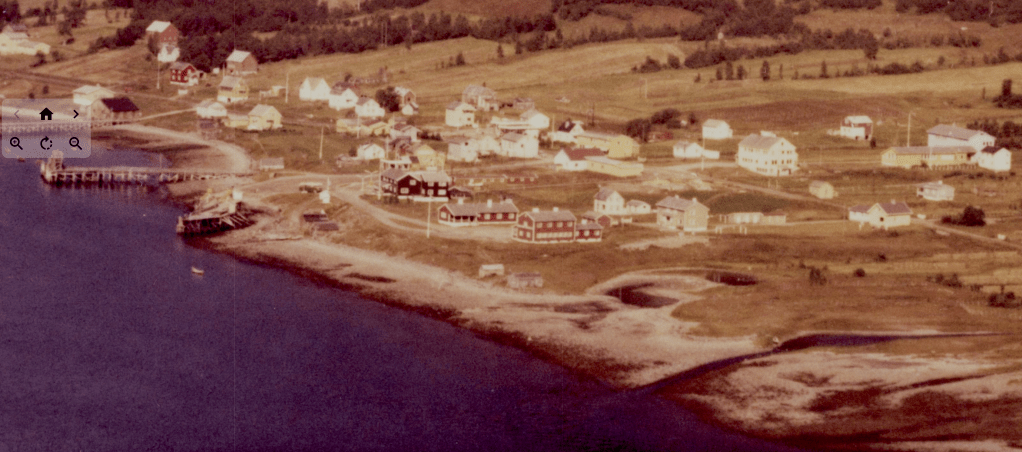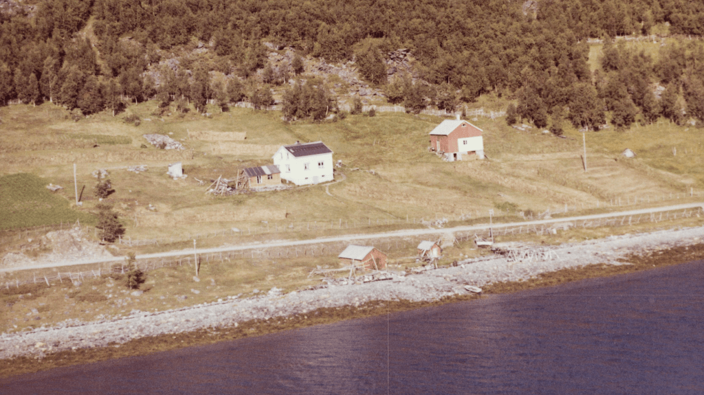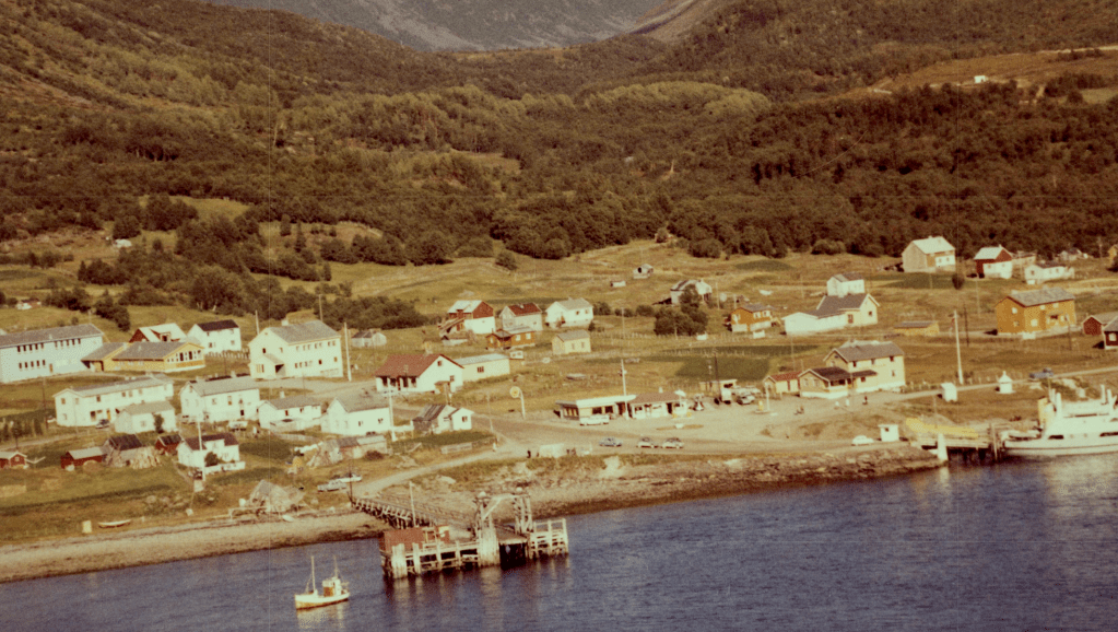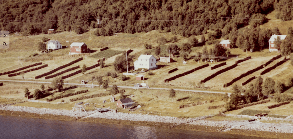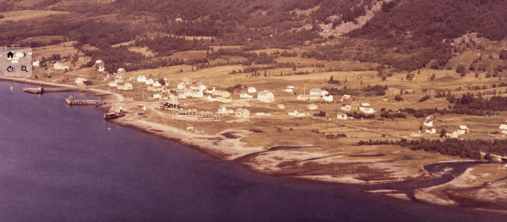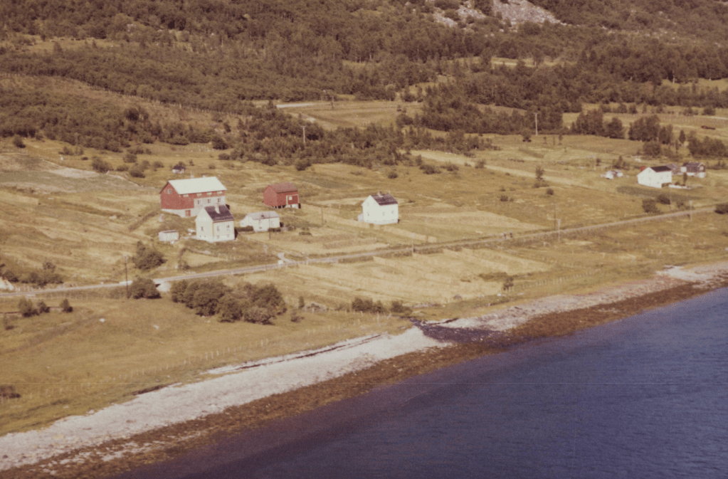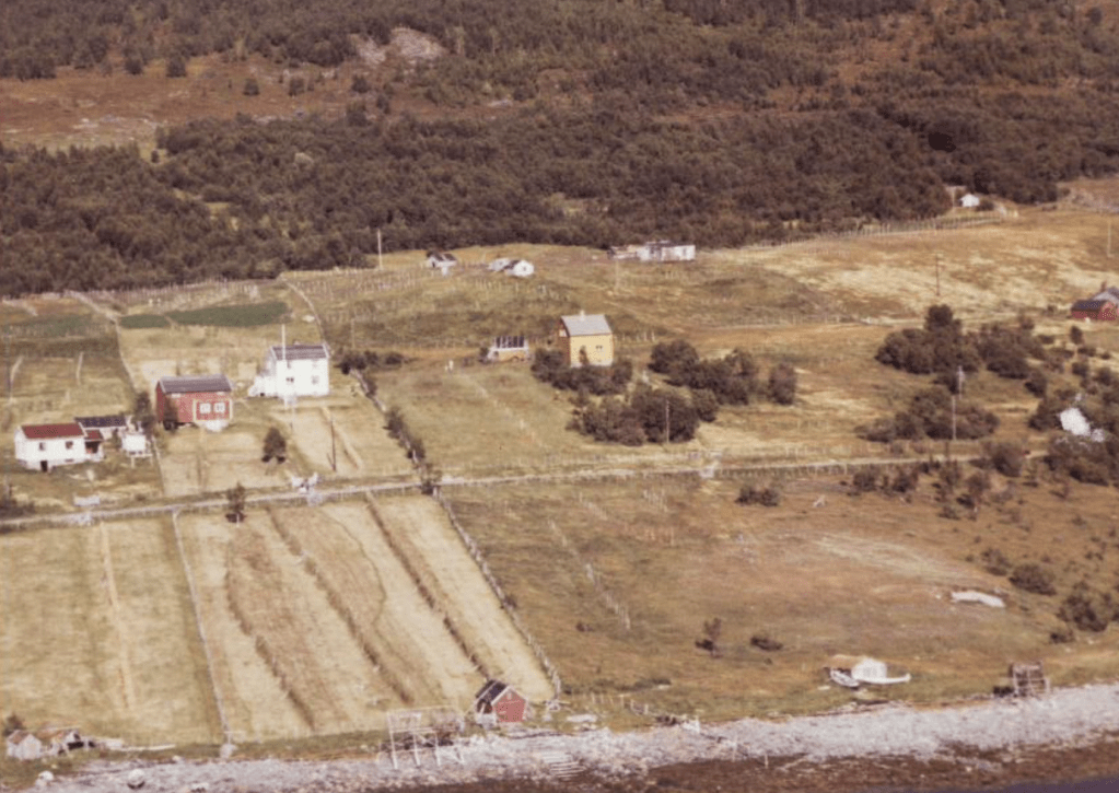 Til høyre i et lite hvit hus bodde Else og Bjarn Soleng. Like bak der et enda mindre hus hvor min bestemor Rasmine Olsen bodde. Videre ser vi for huset til Gudrun og Arthur Soleng og Gerd og Olav Olsen. Oppe på bakken (Tjårrobakken»)bodde Henrik Olsen i det minste huset. Til venstre for Henrik bodde Agnethe og Ole Olsen, i en gammel brakka fra krigens dager. Nedenfor veien, der Fritz Henrik bor, kalte vi for»Storsommar». Der hadde vi mange harde fotballkamper.Tidlig bart på våren.