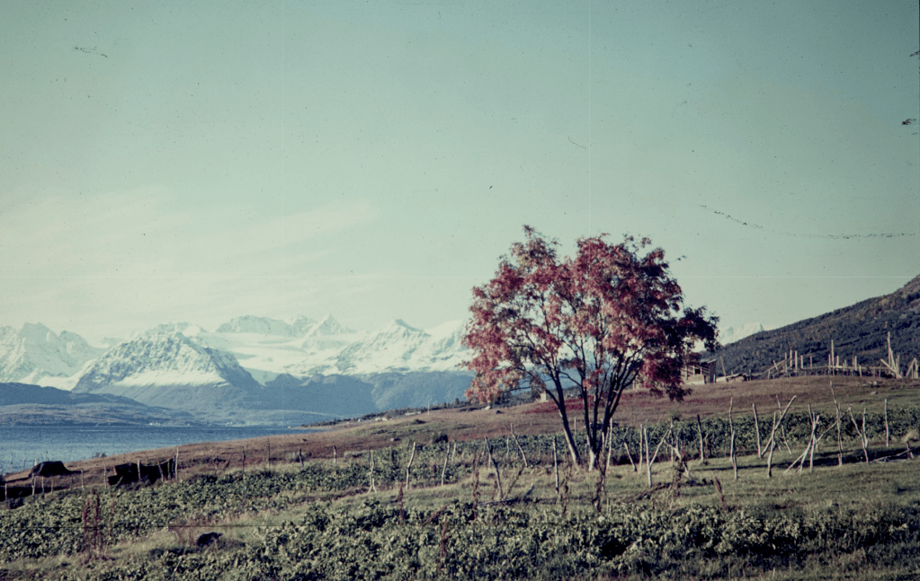 Artig bilde. Der treet står bodde «Giste Marja». Vi kan se byggeaktivitet på bakken like bak. Kan være presteboligen eller Peder Mathisen jr. Dette bildet er tatt i 1962.