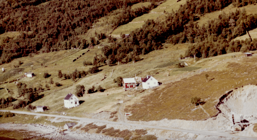 I det hvite huset lengst til venstre på bildet bodde Ida og Reidar LIllevik. Brakka i forkant av det store fjøsen er butikken og boligen til Olav Olderdal («Tinnola»). I det gule huset,(delvis skjult) bodde Tina Olderdal og Tormod Albrigtsen.