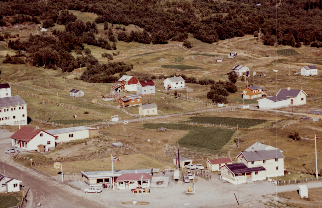 Her er vi i selve hjertet av Olderdalen. Kafe Expressen, Shellstasjonen og Samvirkelaget. Til høyre i bildet Alskog Gjestgiveri. Øverst i venstre billedkant ser Herredshuset fra 1950. Legg også merke til bygget nederst i høyre billedkant. Oljehuset etter kystverket som ble brukt til oppbevaring av olje.
