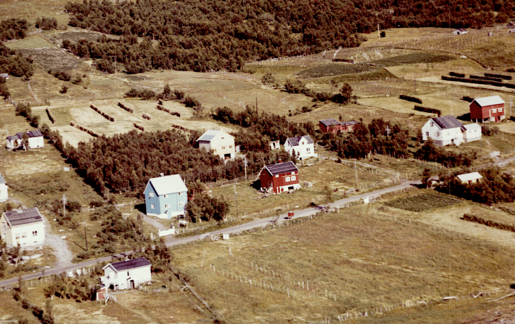 Her er jeg godt kjent! Øverst helt i venstre billedkant ser vi huset til Anna og Hilmar Haugen. Nedenfor der ser vi litt av huset til Ebba og Bernhard Mathisen. Nedfor der Alberta og nedenfor veien Eilif og Lise. I det blåe huset bodde Ragnhild og Jens Johansen. Til høyre for Jens og «Hilda» er mitt barndomshjem der Ardis og Øyvind bodde. Videre Bertine og Einar Soleng.