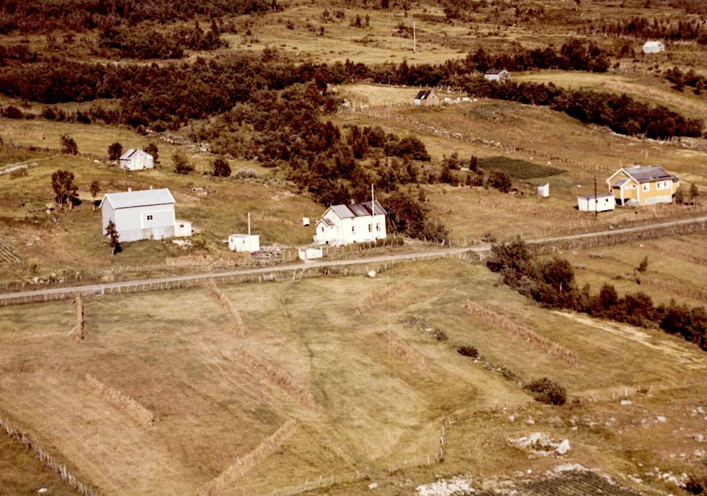 Huset til Jenny og Erling Sivertsen sentralt midt i bildet. Det er også barndomshjemmet til forfatteren og kunstneren Odd Marakatt Sivertsen. I det gule huset til høyre bodde Solveig og Malvin Sivertsen.