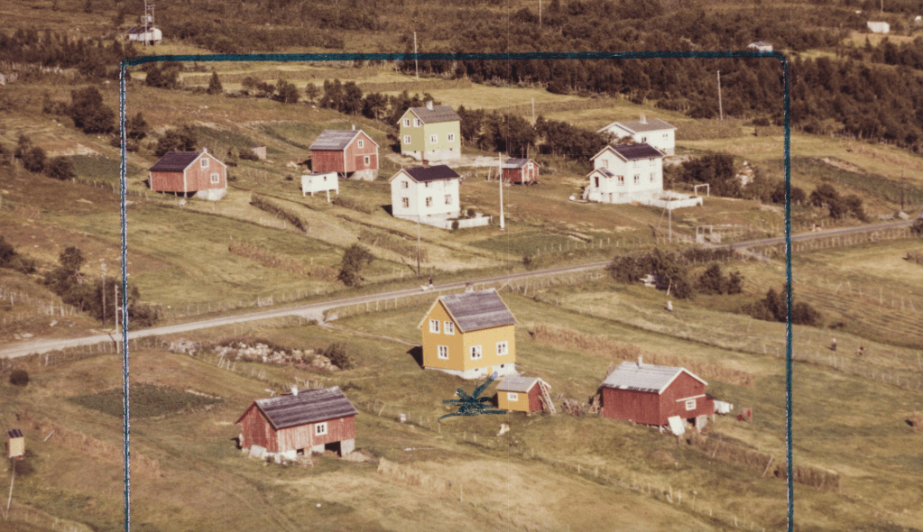 Det lyseblå huset midt i bilde er hjemgården til forfatter Idar Kristiansen. På dette bilde har fotografen fått med seg huset til Arne Johansen og «Anna Soini», lengst til høyre