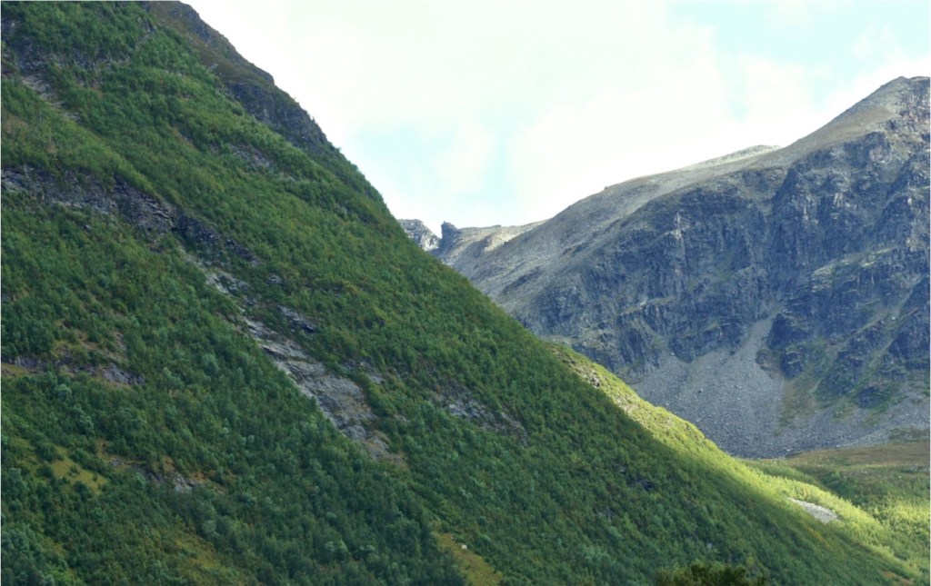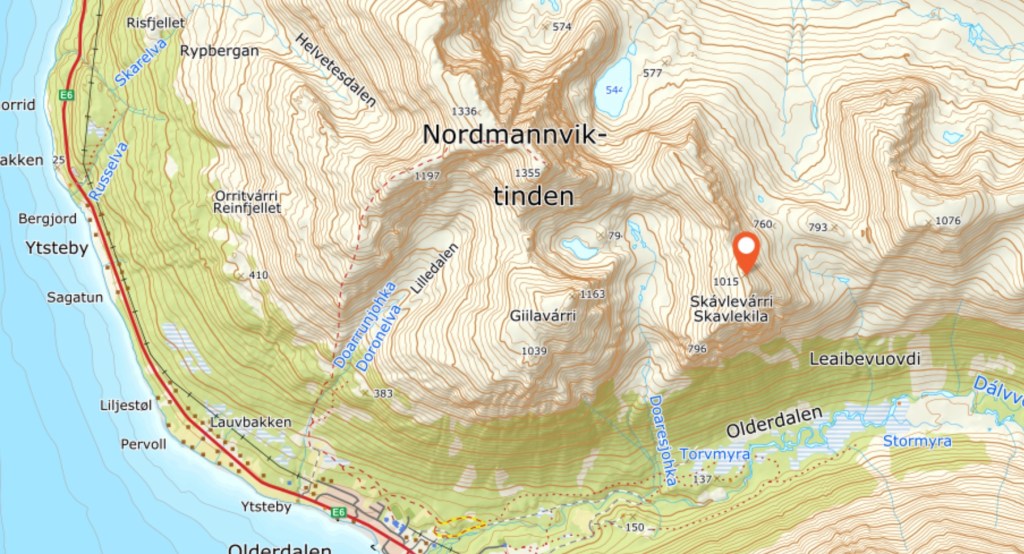 Skávlevárri med Skávlekila og Ciccekila i fronten.Vi ser toppen av Kjeptind og bergflågene i Skávlevárri .