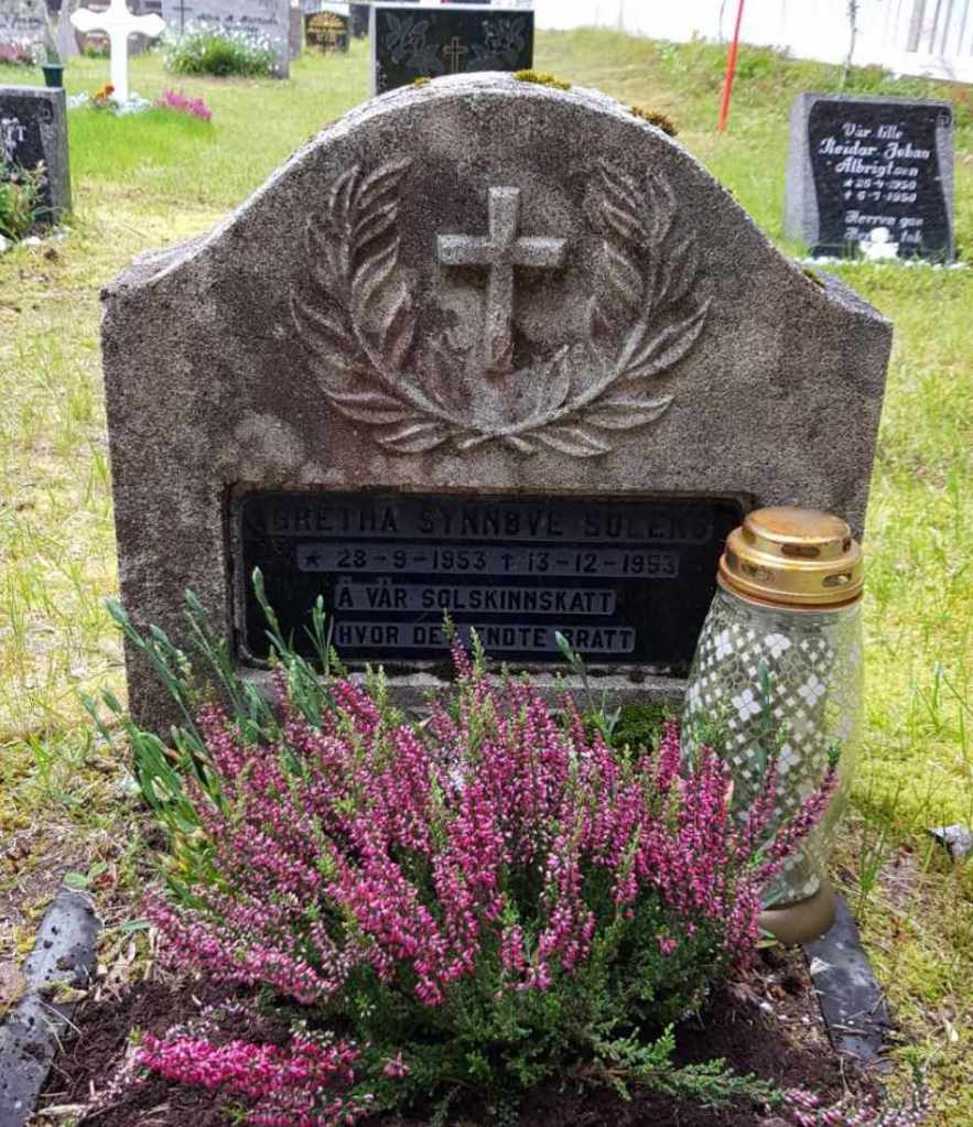 I 1953 fikk jeg en liten søster. Tradisjonens tro ble det utført hjemmedåp og jenta fikk navnet Greta Synnøve. Selv om vi var tre søsken fra før, var det stor stas å få en ny. Så en morgen fant vi Greta død i senga. Det ble konstatert krybbedød. Det var like før jul så sorgen ble ekstra sterk. Som barn levde vi med sorgen på vår måte. Ingen hjelp, vi måtte klare oss sjøl, slik var det bare.. Jeg har et klart og sterkt minne fra den gang. Om det er bilde jeg har laget meg sjøl er jeg usikker på. «Jeg holder min søster i hånden – ser opp mot en stor klar måne og synger»: