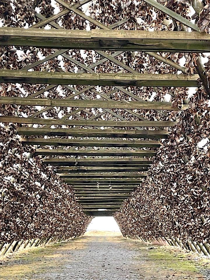 På Svinøya i Svolvar finnes lange fiskehjeller med tørket fiskehau. Legger ut et bilde fra vinteren 2022.