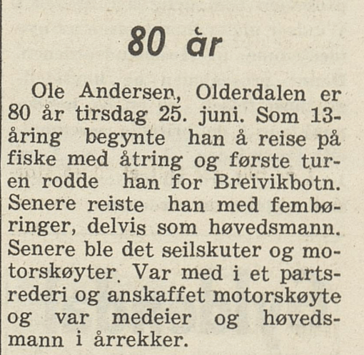 I godt voksen alder rodde han fiske alene over hele Nord Troms, og som nevnt tidligere var han den første som begynte med kommersiell fiske etter flyndre.