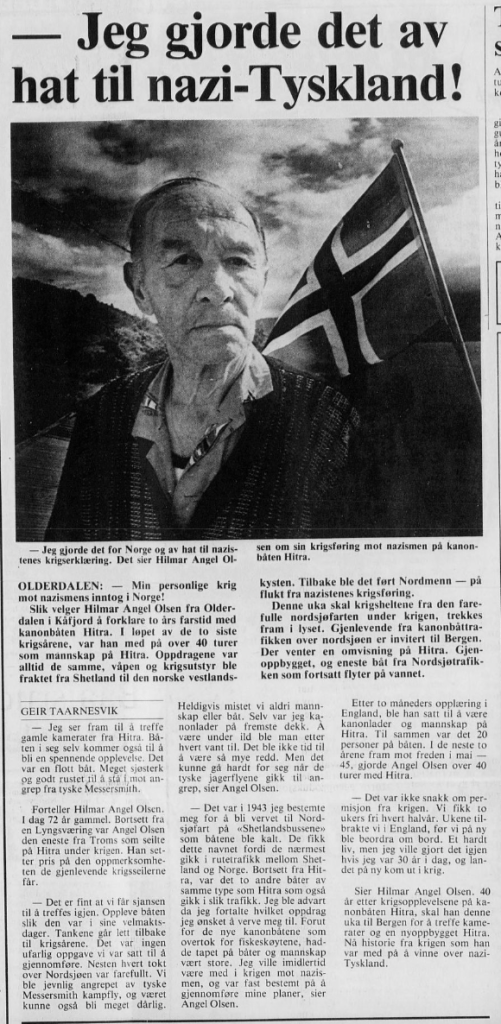 Med 45 turer over Nordsjøen er Hilmar en av de store krigsheltene fra Kåfjord. Kåfjord som mange andre kommuner har ikke satt pris på de som kom hjem med livet i behold. Nordlys 14.07.1987 ved journalist Geir Taarnesvik.