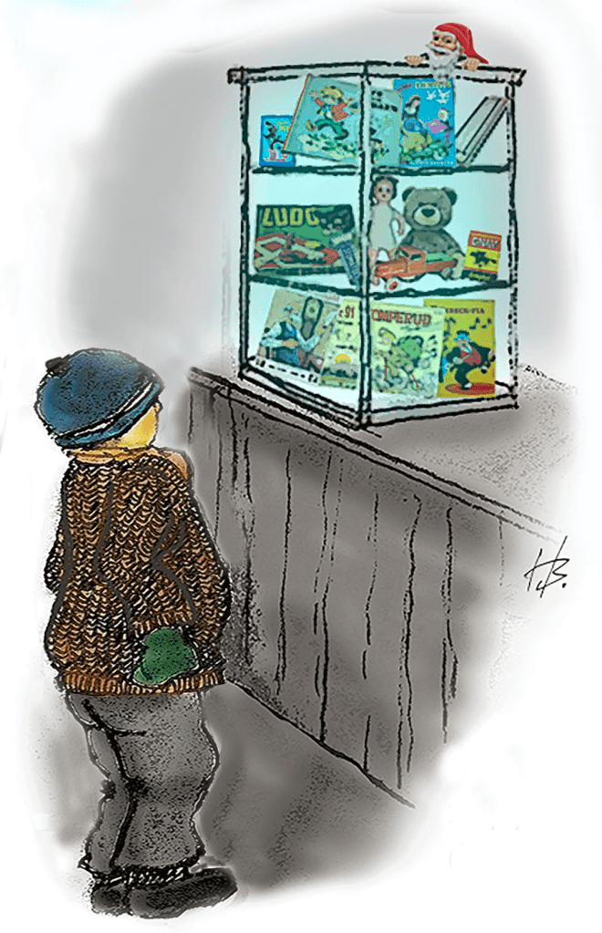 I erindringene om adventa i 1951 – eller var det 1952(?) – er juleutstillingen på Koop’en, – i den grå og slitne samvirkelagsbrakka på haugen i Olderdalen. Den besto av et glasskap som sto på disken. Inni dette glasskapet kunne man storøyd betrakte herlighetene, der f.eks. produkter av det syntetiske materialet plast nesten fullstendig glimret med sitt fravær. Det kunne være et munnspill, kortspill av typen Gnav, en lastebil av tre, Stomatol tannkrem, julehefter med Fiinbeck og Fia, Stomperud og Vangsgutane, speider-kniv og Ludo. Slik var virkeligheten den gangen, i advent