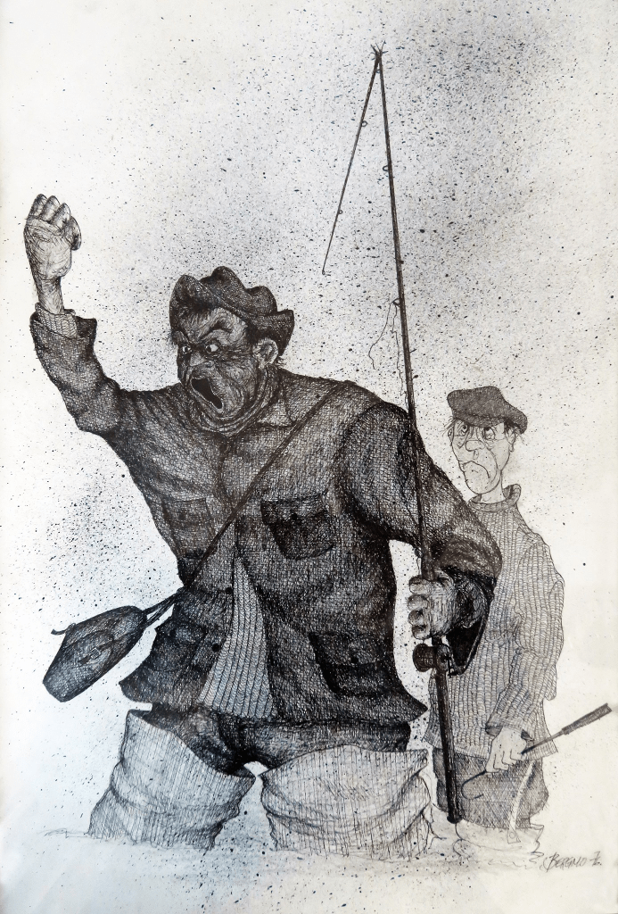 Må snart begynne å sitere Hamsun og kalle mine sjeldne besøk i hjembygda for «paa gjengrodde stier» – og man gjenoppdager ved disse besøk saker og ting uavlatelig der borte. Denne gjenoppdager jeg forsåvidt på en vegg i Olderdalen hver gang jeg er på besøk. I helga hadde jeg med meg fotografiapparatet og fikk knipsa av «kunstverket». Ser at den er tegna med tynn tusjpenn i 1976, og er nok ment å illustrere en hendelse i Altaelva (verdens beste lakseelv). Trur det var en uforsiktig eller uheldig elvebåtfører som fikk nylon i propellen på sin ferd forbi en laksefiskende kompis. Det ble mye roping og bannskap (mye bannskap) og mere til – fisketuren og helga var spolert, selvsagt. Jeg har benyttet meg av noen kunstneriske friheter, ser jeg. Ørlitegrann dramatisert, og det har man lov til i kunstens navn, har jeg lest et sted.