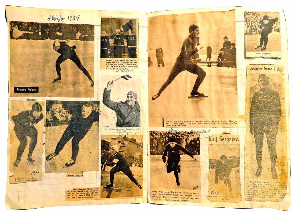 To sider i bokføringskladdeboka med skøytebilder her av gamle helter, limt over både «aktiva» og «passiva». Deriblant et par fra den tida sovjetrusserne begynte å hevde seg for alvor. Nederst til venstre et utklipp av sprinteren Jurij Sergejev, «verdens hurtigste skøyteløper», som det står i billedteksten. Avisutklippet til høyre nederst viser Boris Sjilkov. Han satte i 1955 en verdensrekord som mange nektet å tro på. Det skjedde på den sagnomsuste Medeobanen i Alma Ata da han slo den tidligere rekorden på 5000 meter med 18 sekunder. Ikke rart han ble en favoritt. Boris Sjilkov døde i 2015, 87 år gammel.