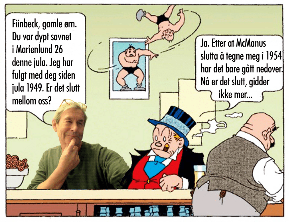 Fiinbech og Fia har vært faste julegjester i alle herrens år her i huset. Men nå er det slutt. Bare reprise etter reprise de siste årene. Jeg fikk nylig innpass i hjemmet til ekteparet og gjorde et intervju med Bech (se bilde). Han uttrykte misnøye med den etterhvert synkende kvaliteten på tegningene særlig etter at skaperen George McManus gikk bort. Så da kan det være det samme. Velsigne ditt minne, Bech. Blir bare «Vangsgutane» i Marienlund 26A heretter.
