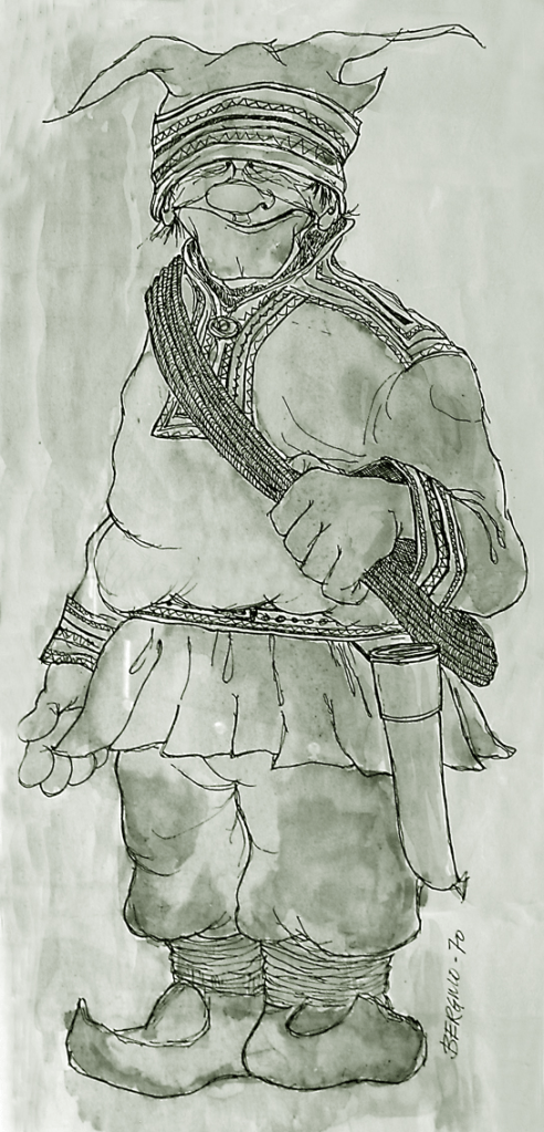 Denne trivelige reingjeteren er muligens en gammel slektning av meg. Ikke så nøye med hva han heter, men han har tydeligvis en jobb å trives i. Vi spiser mye reinkjøtt i Finnmark og det er snart tid for partering av en reinskrott til bl.a. steik og bog og fabelaktig buljongkjøtt. Gubben her lagde jeg for over femti år siden, – han henger til inspirasjon på arbeidsrommet.