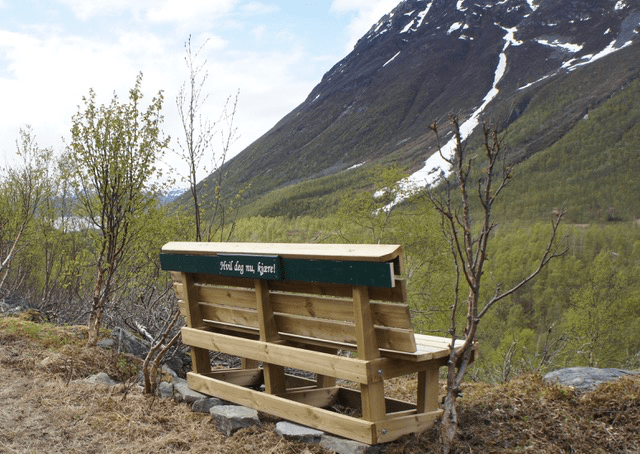 Den mest fotograferte benken i Olderdalen. Tekst: Hvil deg nu , kjære!