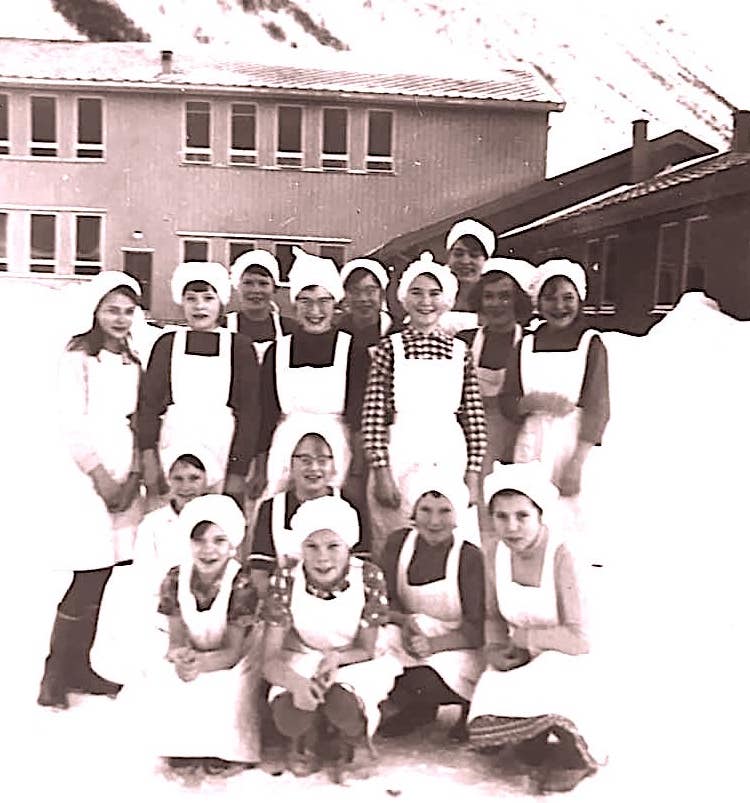Jentene i 6 og 7 klasse fra Djupvik skole. Husstell på Olderdalen skole 1963. Fra venstre bakerst: Herlaug Henriksen, Aud Olsen, Liv Nilsen, Ingrid Salamonsen, meg, Anne Britt Nilsen, Randi Solem, Laura Pedersen og Sylvi Isaksen. I midten: Britt Salamonsen og Unni Hansen. Foran: Lillian Salamonsen, Alma Eliassen, Elsa Paulsen og Kristine Jenssen. Foto: Else-Marie Finstad