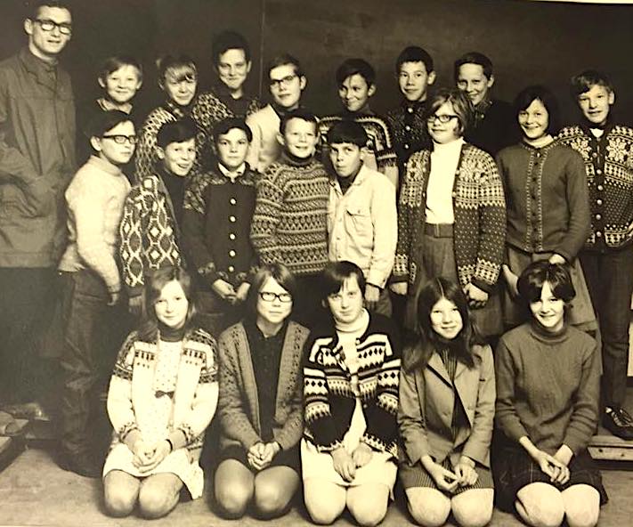 Fra venstre Vigdis, Inger, Johanne, Norunn, Karin Tove, Eilif Arnt Alf Peder Yngve, Per- Sigmund, Gerd eg Tor Anton Nils Ole Øystein Viktor Odd Anskar og Asle. Vanskelig når det mangler komma. Hjelp!