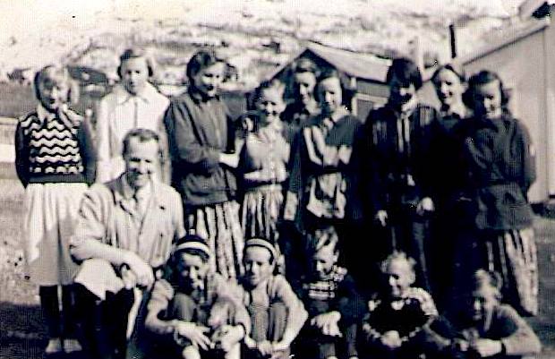 Bak fra venstre: Astrid Mikkelsen, Reidun Nilsen, Judith Isaksen, Else Salamonsen, Arne Simonsen, Reidun Simonsen, Willy Johannessen, Inger Jensen, lærer Karl Ness, Arne Eliassen, Ivar Salamonsen, Bjarne Berg, Johannes Jensen, Johannes Wiik.