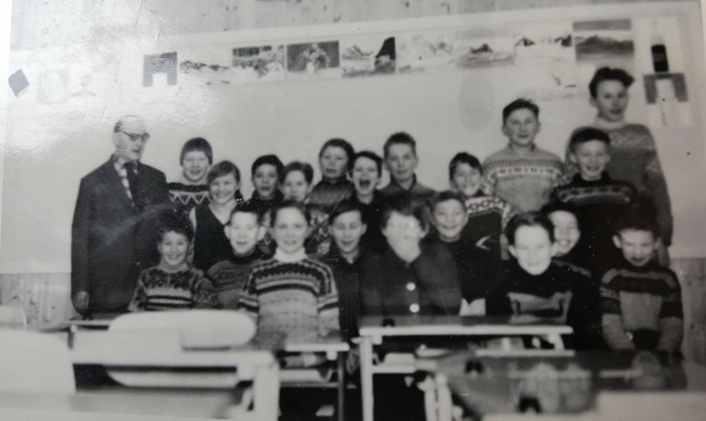 Navn på lærer og elever. Lærer Martin Nygård. Bak fra venstre: Karin Johansen, N 7, Toril Olsen, D7, Erling Johansen,N7, Odd Arvid Nilsen,N6, Asmund Eliassen, N7, Jan Erik Strømsvåg, N6, Gunnar Lauritz Pedersen, N7, Johan Nilsen, D6, Ole Jensen, D7, Knut Berg, N 6, Helge Nilsen, D7.