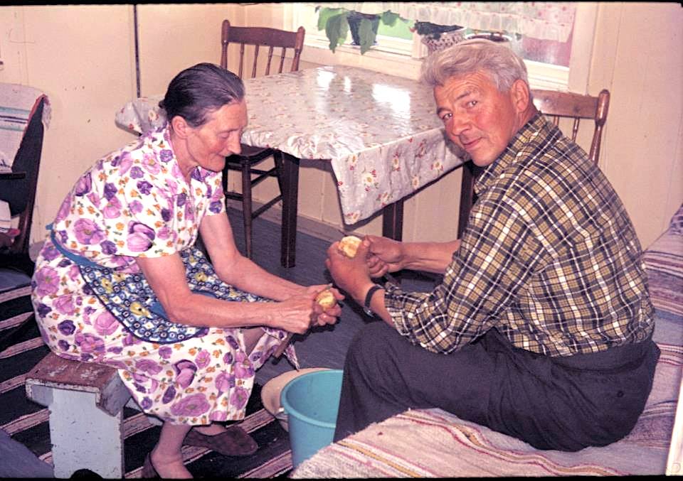 Mine besteforeldre Sofie og Aksel skreller poteter til søndagsmiddagen.