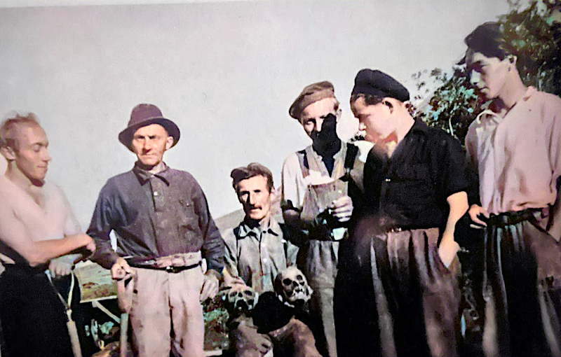Arbeidsgjengen på veien mellom Olderdalen og Birtavarre i 1946. Fra venstre: Paul Holst Mikkelsen, Ole Martinsen, Peder Larsen, Ludvik Hansen, Erling Jensen og Arne Hansen. Vi ser Peder Larsen holder to hodeskaller i hendene. Foto: Erling Jenssen. Redigering: Jan R. Olsen.