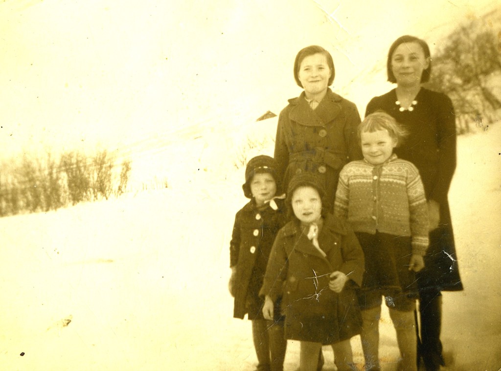 Gerda Eriksen Soleng og Martha Hansen med Valborg Mørch og Peder Soleng sine barn. Bilde er tatt under «Tjorrobakken»