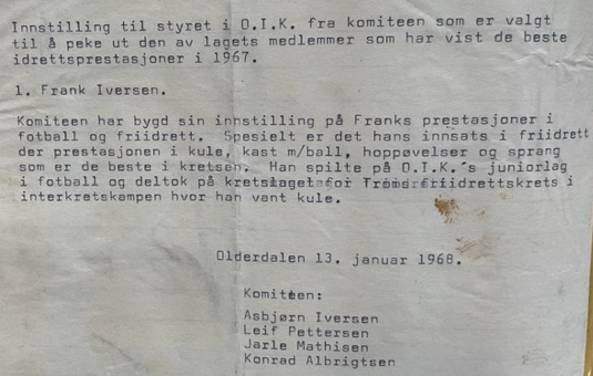 Olderdalen idrettsklubb var veldig stolt av Frank. Han var det største friidretts -talentet vi noen gang har hatt i klubben.