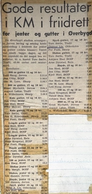 KM i friidrett 1965. Hans Johan Lie kretsmester i spyd klasse 15-16 år. Gunnar Lie nummer 2 i gutter 17-18 år. Begge Olderdalen idrettsklubb.
