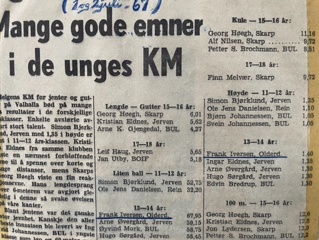 Vi ser Frank Iversen vinner liten ball over 8 meter foran neste mann i klasse13-14 år. Selv i høyde vinner Frank sin klasse.
