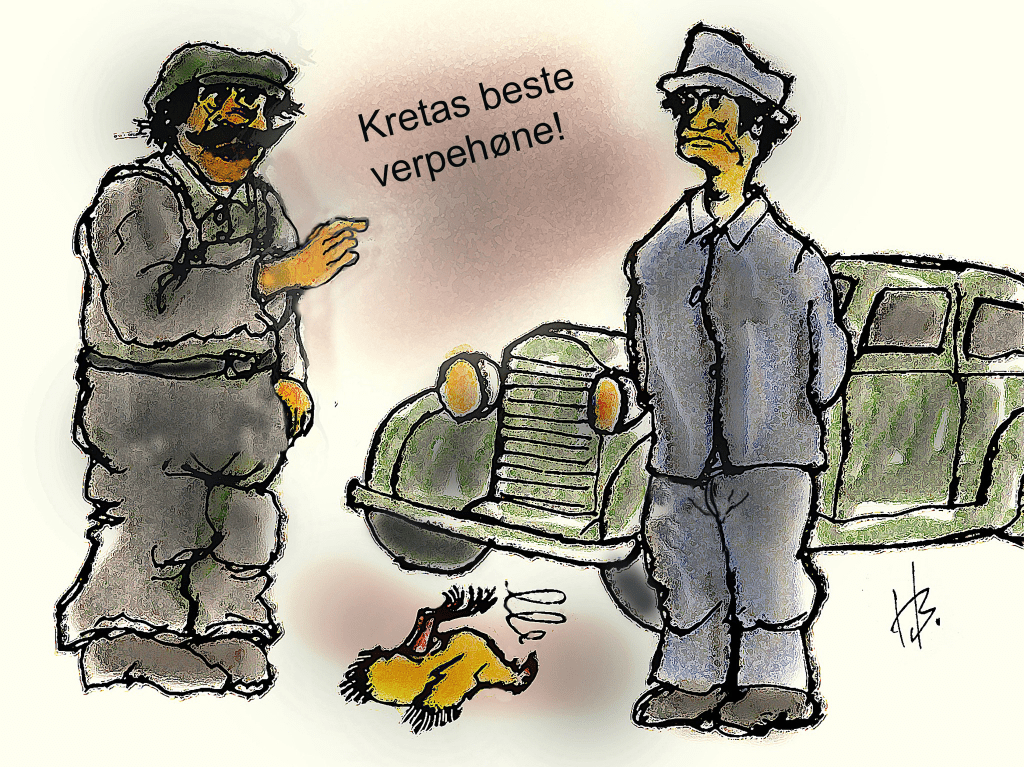 Den norske journalist og forfatter Nils Werenskiold, som levde fra 1920 til 1991, var godt kjent med landsbylivet på den greske øya Kreta. Han skrev bl.a. en gang om en norsk bilturist på øya som var så uheldig å kjøre på en høne som sprang over veien, – den døde. Han stoppet pliktskyldigst – og fikk seg en høyrøstet overhøvling på gresk av han som eide høna. Den stakkars turisten fikk det bestemte inntrykk at han var skyld i at Kretas beste verpehøne var blitt brutalt myrdet! Han fant derfor fram 50 drakmer, tilsvarende rundt 12 norske kroner den gangen, som han ga til den opphissede og sinte høne-eieren. Denne sluttet øyeblikkelig å være sint, og spurte istedet om denne uheldige turisten kom samme vei tilbake? Jo, det skulle han på ettermiddagen. – «Fint, da spiser vi høna ilag», fikk han beskjed om. Den avdøde hønas eier hadde på ettermiddagen likegodt slaktet en høne til «fordi én høne var altfor lite for to», mente han. Og da de for alvor var kommet i gang med måltidet vred han halsen om på to høner til, – «fordi vi må ha noe å bite i til vinen», mente han.