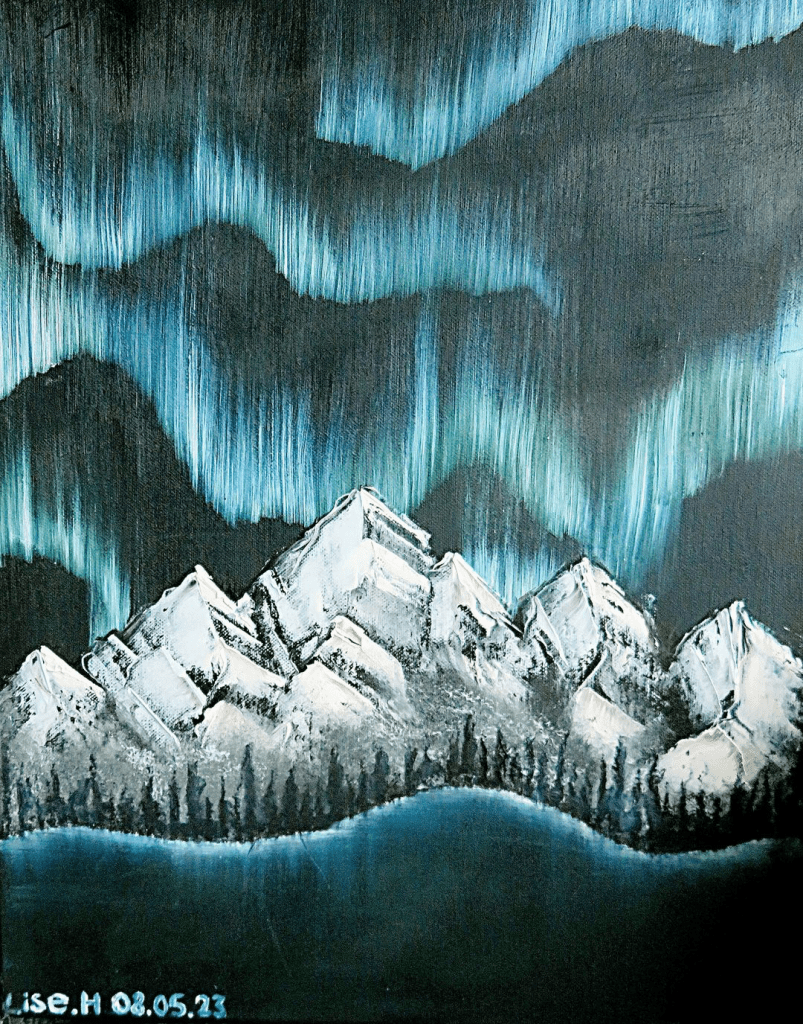 Poenget her er at da jeg ankom Rivarbu forleden sto dette kunstverket og ventet. Signaturen er «Lise». Her er det kunstneriske og tekniske anlegg i bøtter og spann, mener jeg, og herved anmodes at Lise får den oppfølging som trenges for videre, kunstnerisk og teknisk utvikling. Hytta vår i Langfjorden, «Rivarbu» er fra før fullstappet med amatørkunst på alle vegger, men vi skal rydde plass til dette spesielle bildet, laget av Lise Arnesen Hamnevoll.