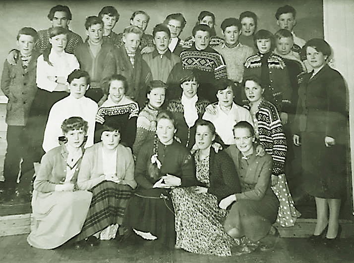 4. rekke fra venstre: Asmund Wasmuth, Alf Johansen, Ingebjørg (Bøgga) Olderdal, Bjørg Solberg, Edna Bjerkeli, Klara Ballovarre, Ann Mari Steinnes, Paul Nilsen. Den unge læreren til høyre het Rigmor Jensen og fra Kragerø.
