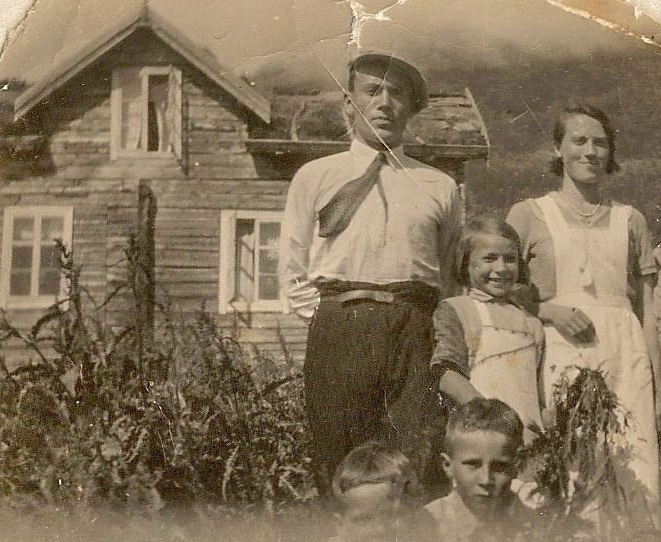 Fra venstre Johan Mathisen og Helene (Lena) Mathisen (Ballovarre). I midten min mor Ardis Helene, Magnus og Erling Olsen. Vi ser huset til min bestefar kvenen Mathias Hans Mathiasen.