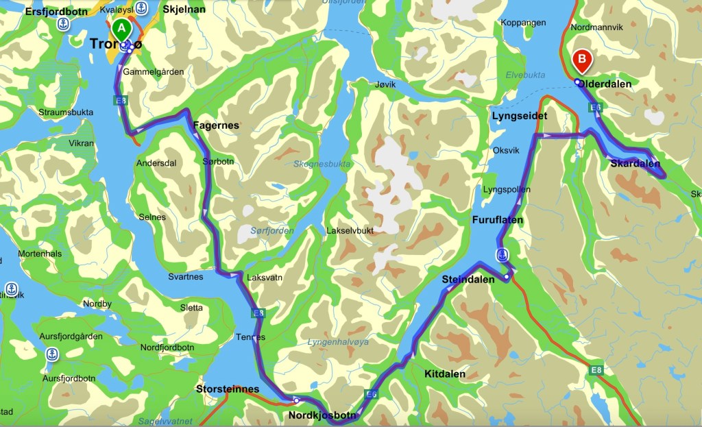 Ved Fagernes i Ramfjord kan man ta av fra E8 og benytte seg av to ferger for å komme til Kåfjord. Trykk på lenken under: