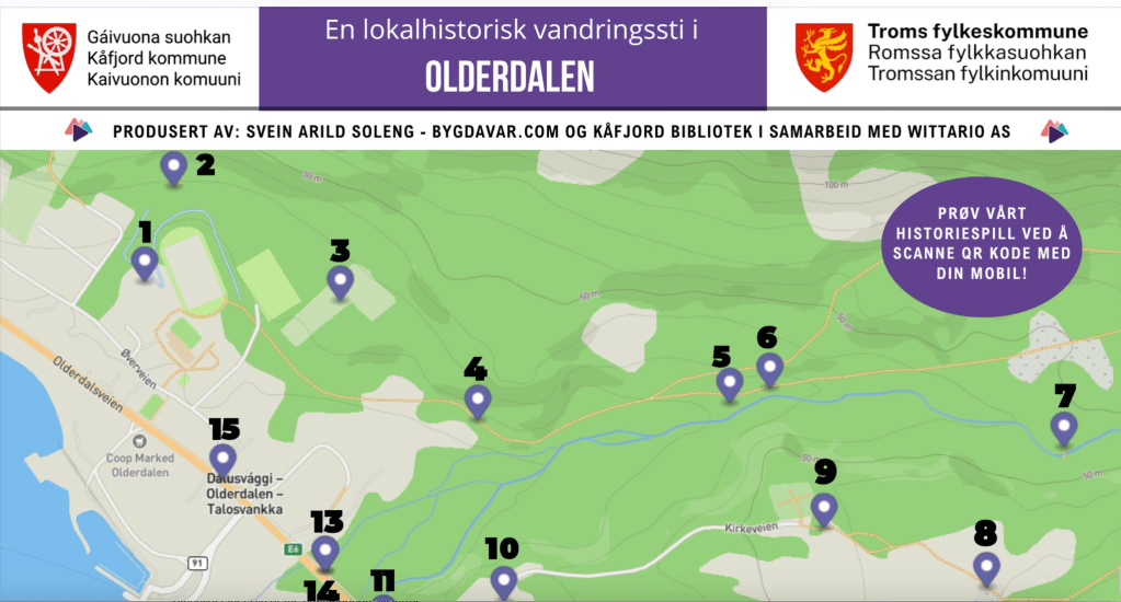 I et samarbeid med Wittario og Kåfjord Bibliotek har jeg laget en lokalhistorisk vandring i Olderdalen. Denne er nå klar til bruk.