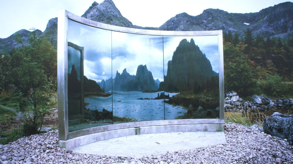 Her er kan vi se noen av bilder av andre skulpturer Nordland fylkeskommune har plassert i andre kommuner.«Øye i Stein «av Anish Kapoor. Har stått ved Løddingen siden 1998.Denne er utført av Dan Graham i glass og rustfritt stål, og står i Vågan kommune.Og denne av en samisk kunstner jeg ikke fikk navnet på. Skulpturen er et vakkert syn når den blir lyssatt på høsten.Flere lignende skulpturer står på paller og skal utplasseres ved den gamle kirken.