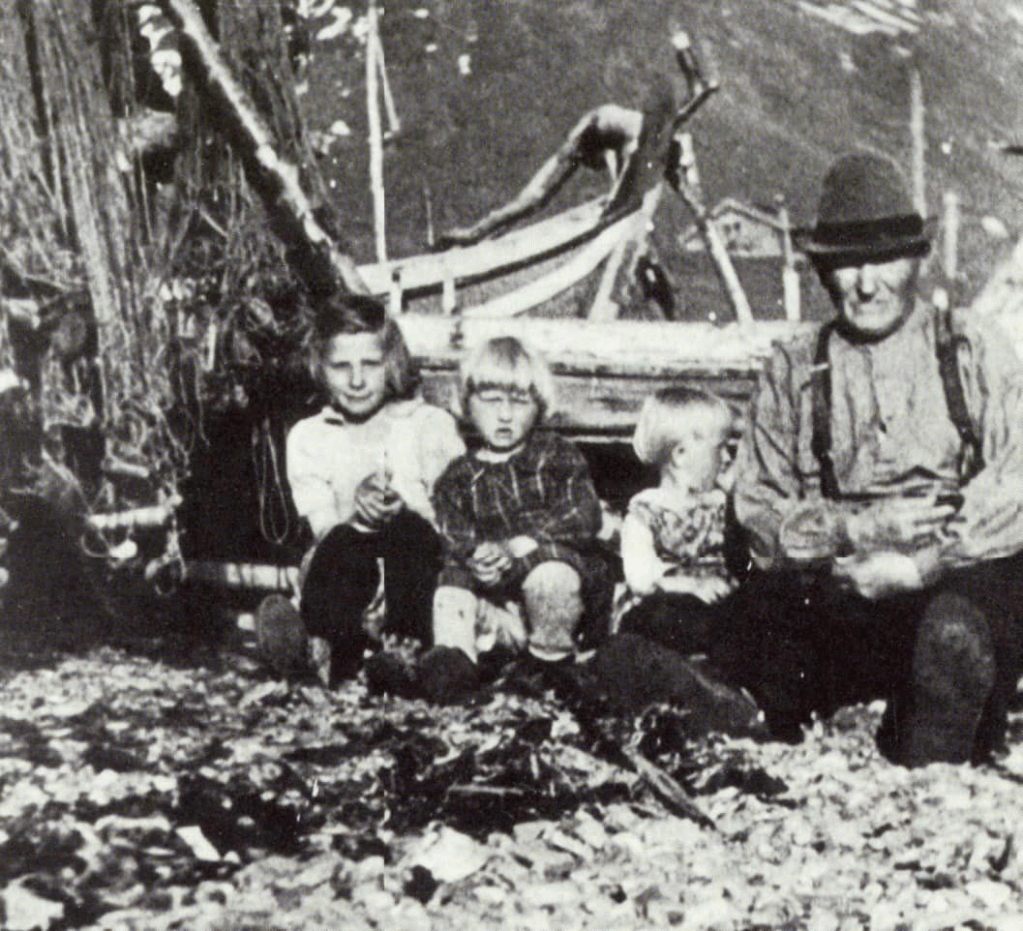 Mathilde 7/11 – Stefanus Pettersen (1867-1963) i fjæra i Olderdalen sammen med barnebarn. F.v. Aslaug Valfride Albrigtsen (Iversen, 1932-2022), Signe Emelie Jakobsen Vannbakken (Grønn, 1937) og Estrid Stefanussen (Voupionpera, 1940). Årstall ca. 1942.