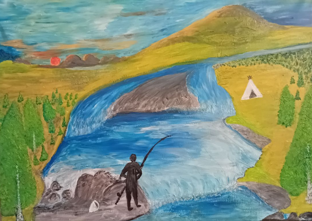 Den tradisjonsrike fiskeplassen Savvan (Savvon) ble dessverre ødelagt på slutten av 1970-tallet som følge av sprengningsarbeid, utført for å legge til rette for sjørøyas vandring opp elva. I dette maleriet har Per gitt sin personlige tolkning av hvordan Savvan en gang var.
